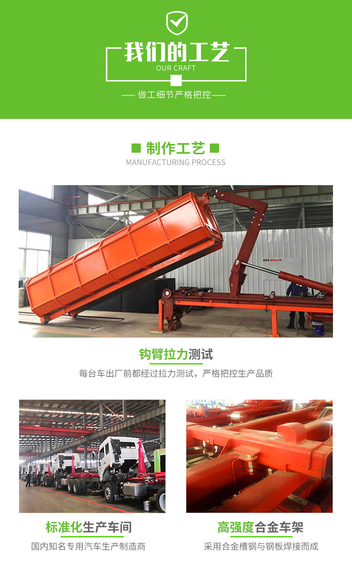 勾臂垃圾車標配:由液壓系統、操作系統、拉臂,組成。舉升油制缸為國內知名液壓件廠家生產的雙作用油缸,多路閥液壓控制,操作員手動控制垃圾廂吊上放下,帶自卸功能,上下一次工作循環時間≤40秒。垃圾箱冷板壓制垃圾箱,帶后門密封圈,帶金屬滾動輪。